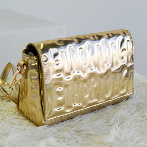 Bolso bandolera color dorado grabado nuestra firma, cierre con cremallera y solapa por encima que se cierra con 2 clips redondos. Interior forrado con rayas de colores.