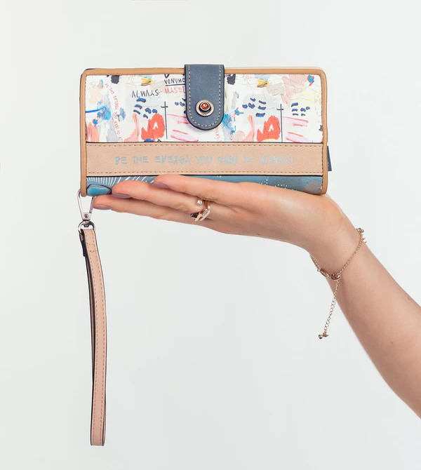 Billetero para mujer ideal para bolsos amplios. Su diseño combina estampado en ambos laterales con toques azules y beige, y su interior es forrado.