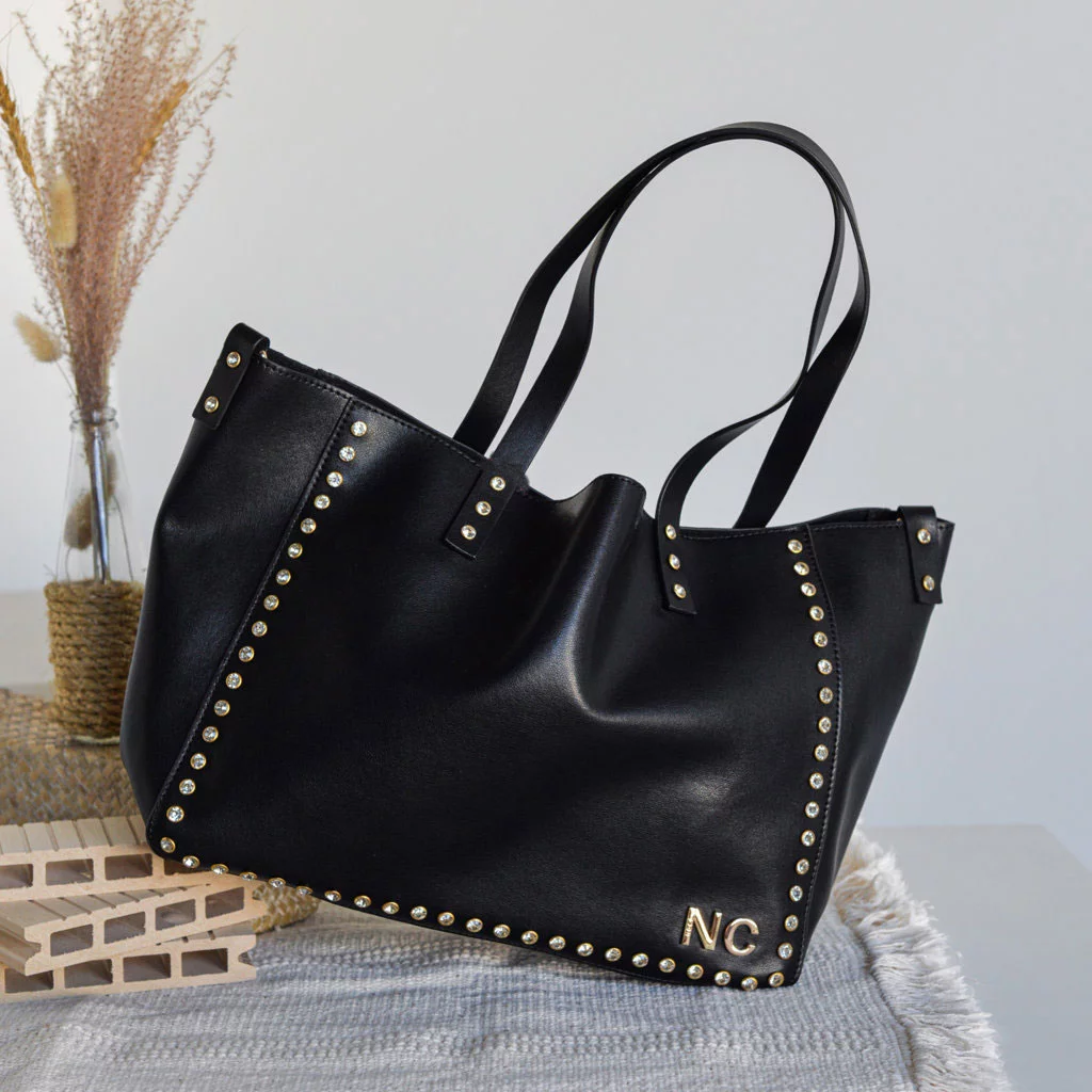 Su interior cuenta con un neceser extraíble, ideal para organizar tus pertenencias más pequeñas y mantener todo en su lugar. Lo que realmente destaca en este modelo son los detalles de tachuelas en forma de cristales, que agregan un brillo sofisticado y un toque de distinción a su diseño.